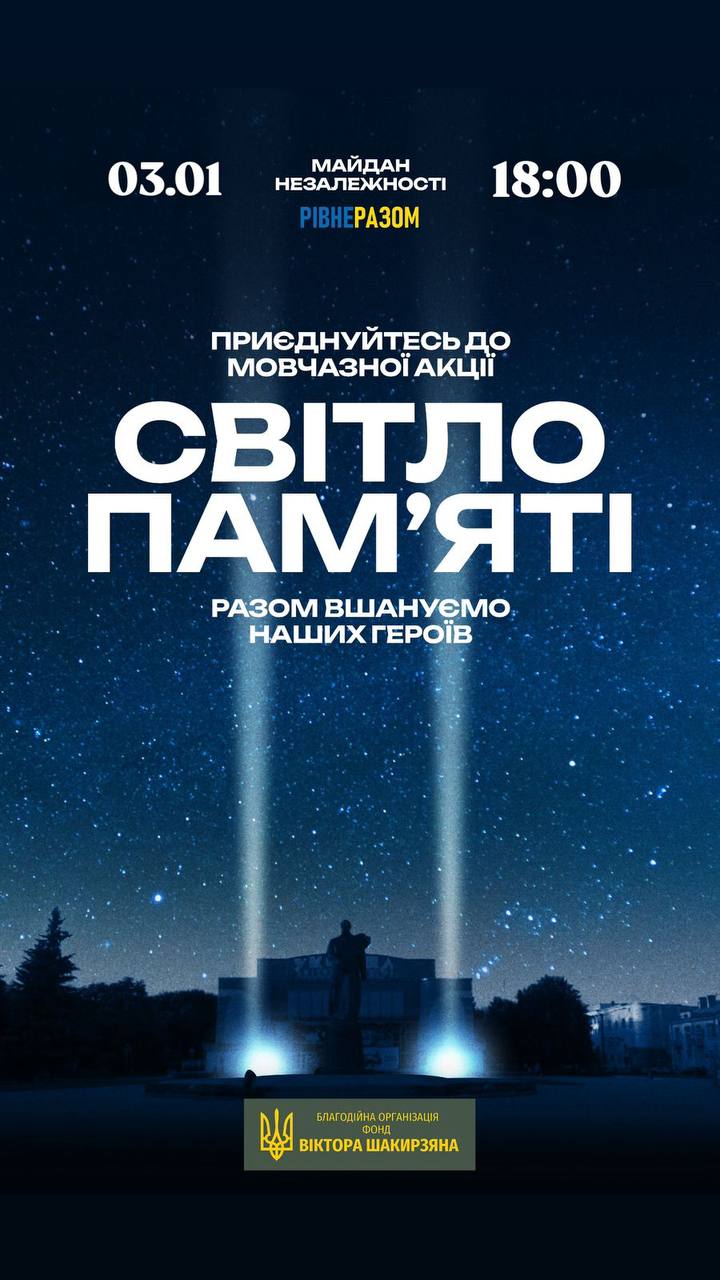 "Організатори мовчазної акції - Громадська організація "Рівне Разом" та Благодійна організація «Фонд Віктора Шакирзяна» запрошують усіх долучитися до вшанування памʼяті загиблих воїнів. Віддамо належну шану кожному полеглому Герою, який подарував нам надію на світле майбутнє", - йдеться у повідомленні Віктора Шакирзяна.