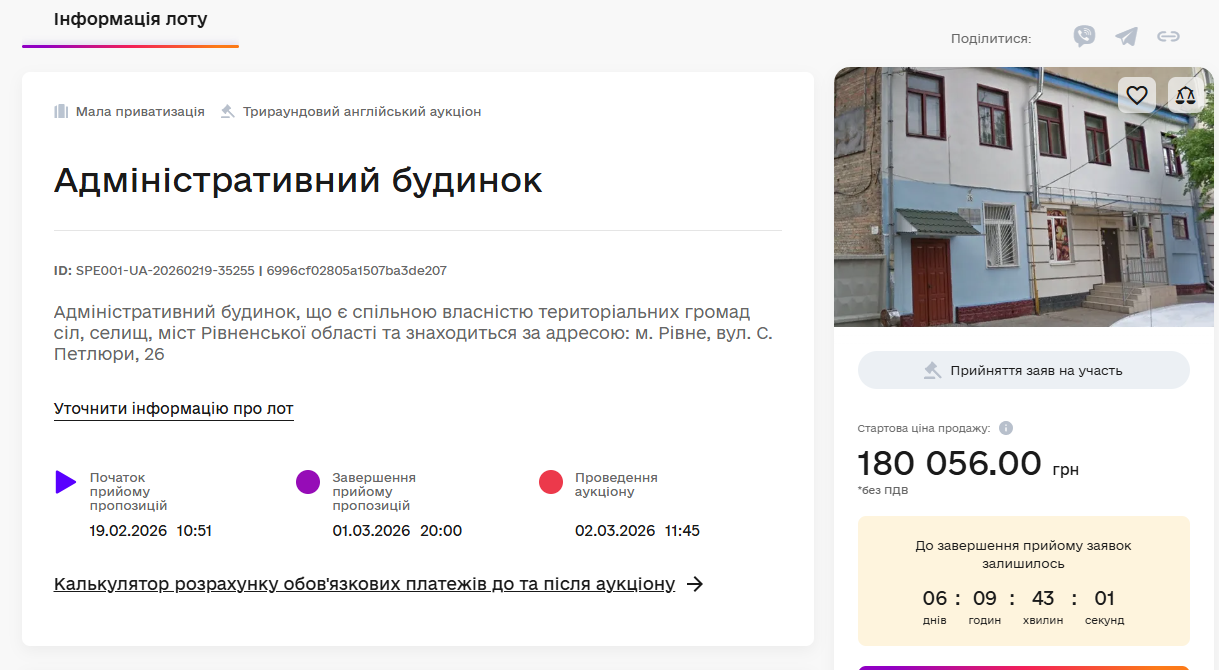 Після безрезультатних торгів у січні стартову вартість об’єкта знизили вдвічі — тепер вона становить 180 тисяч гривень (близько 3,5 тисячі євро).