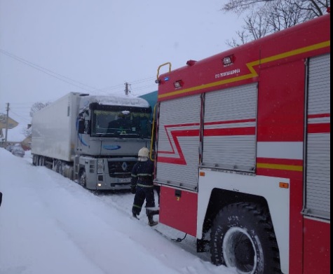Вантажні автомобілі через значні опади та слизьку дорогу не змогли проїхати на цій ділянці дороги та заблокували рух іншим транспортним засобам.