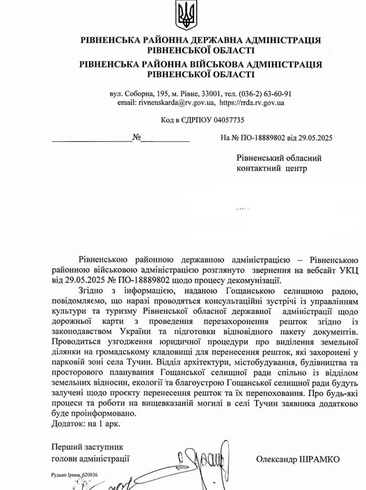 Про це йдеться в офіційному листі Рівненської районної державної адміністрації, який оприлюднив громадський рух «Деколонізація. Україна».