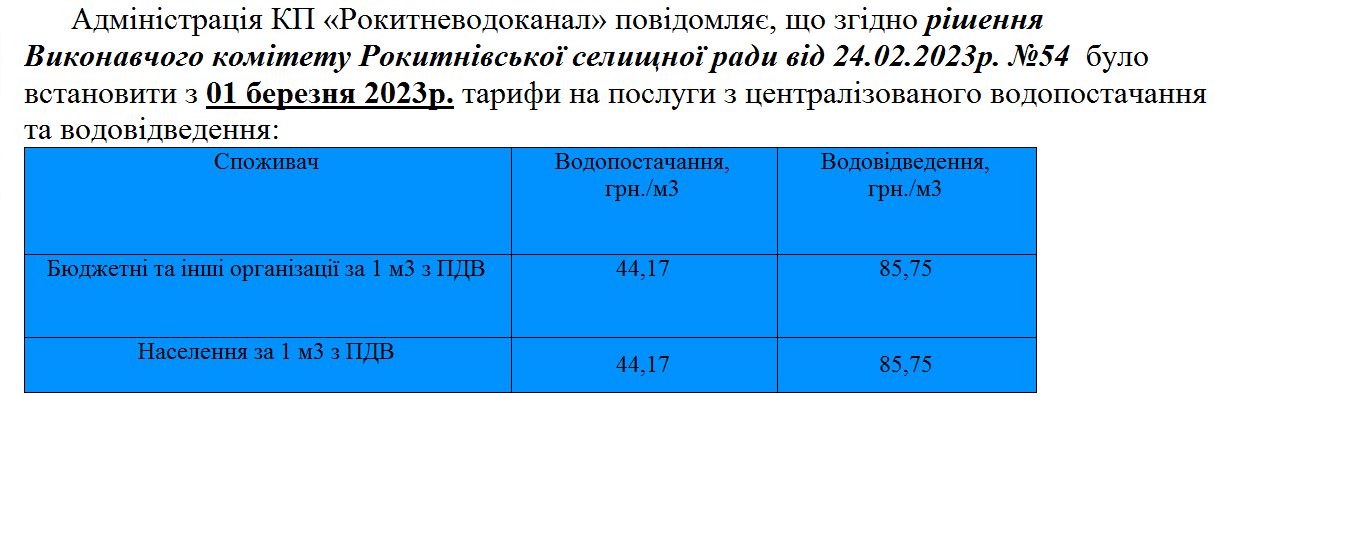 Разом водопостачання та водовідведення коштуватиме мешканцям Рокитного по 129,92 грн за куб.
