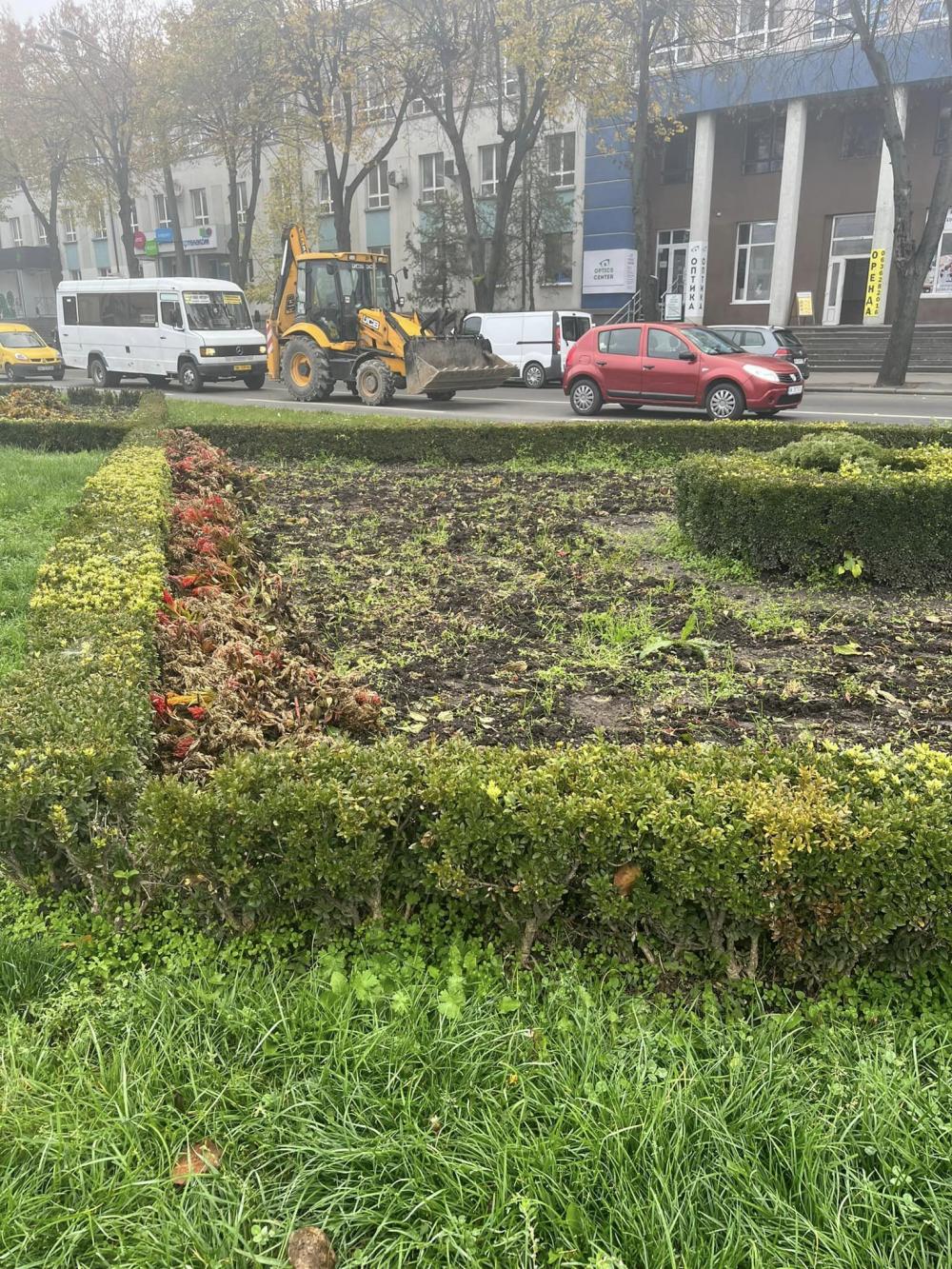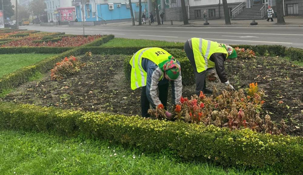 У центрі Рівного на майдані Незалежності працівники тресту зеленого господарства прибрали червону, помаранчеву та жовту целозію, яка відцвіла.