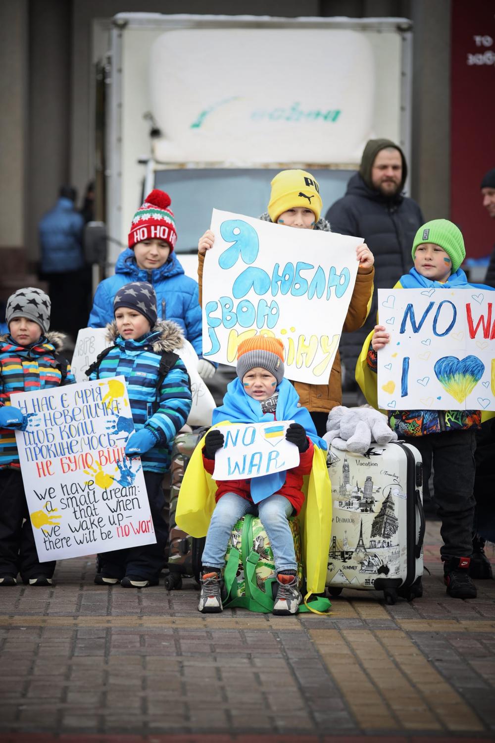 Сьогодні у центрі Рівного місцеві активісти влаштували акцію проти війни в Україні. Так, на Театральній площі зібралися батьки з дітьми, які взяли з собою дорожній рюкзачок та улюблену іграшку.