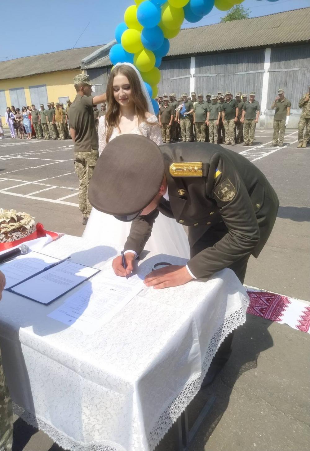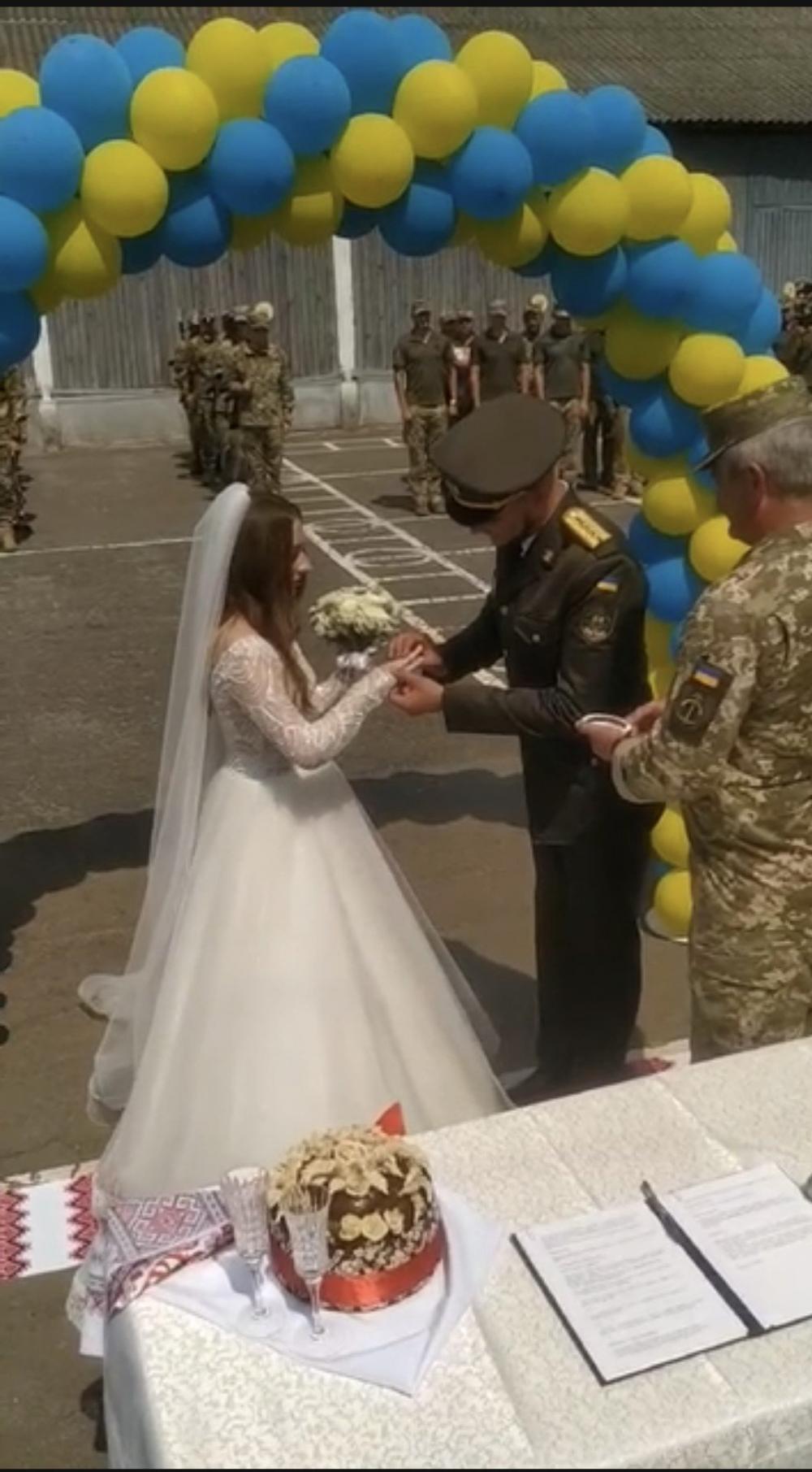 Церемонія весілля відбулась у найкращих військових традиціях – під час шикування особового складу. Акт укладання шлюбу офіційно засвідчив командир військової частини власним підписом та печаткою військової частини. Посеред плацу молодята обмінялися обручками та дали одне одному обітниці.