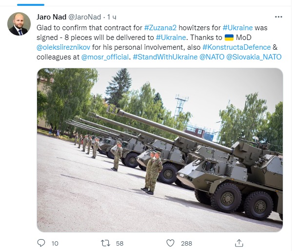 Glad to confirm that contract for #Zuzana2 howitzers for #Ukraine was signed - 8 pieces will be delivered to #Ukraine. Thanks to ???????? MoD @oleksiireznikov for his personal involvement, also #KonstructaDefence & colleagues at @mosr_official. #StandWithUkraine @NATO @Slovakia_NATO pic.twitter.com/yIBvpAqIcK