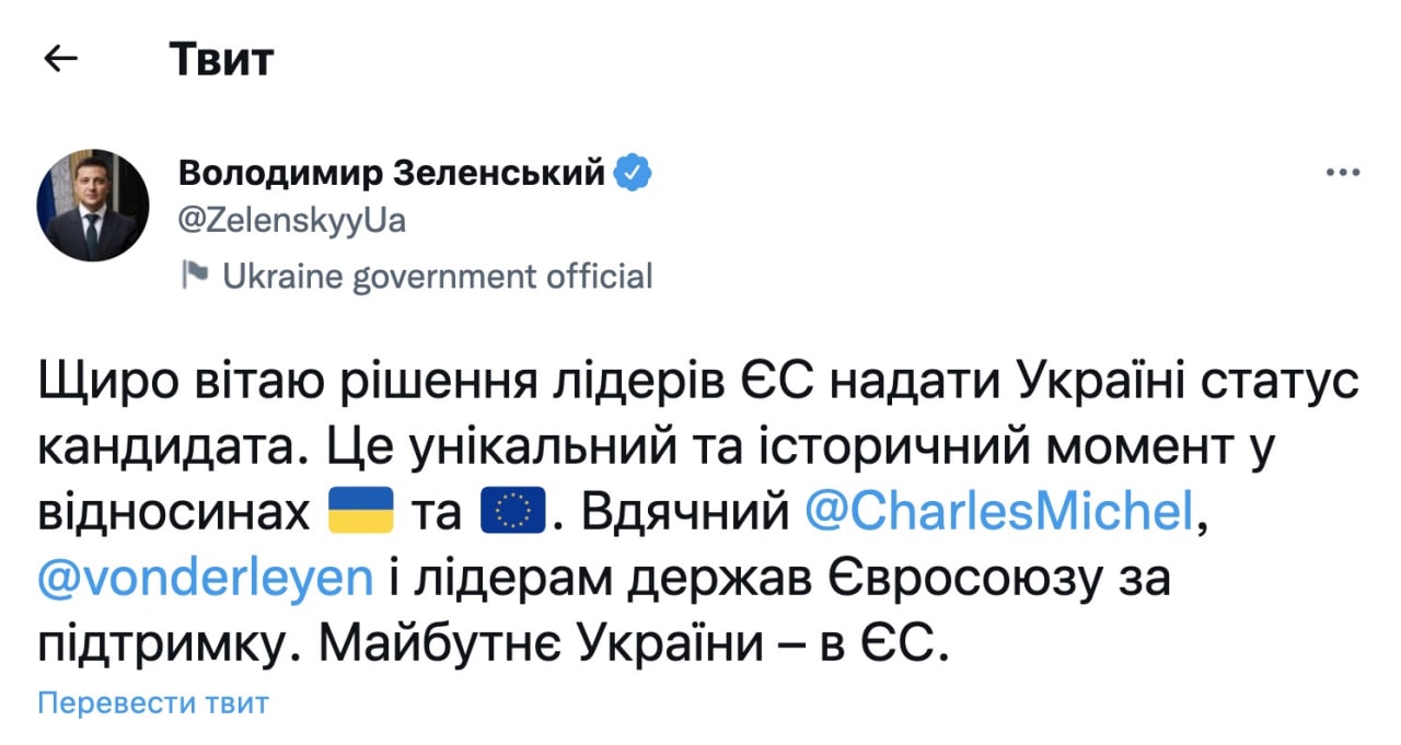 Кандидатство України у члени Євросоюзу отримане. 23 червня 2022 року точно увійде в історію.