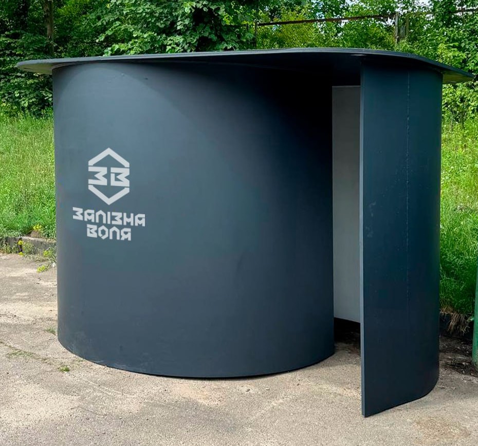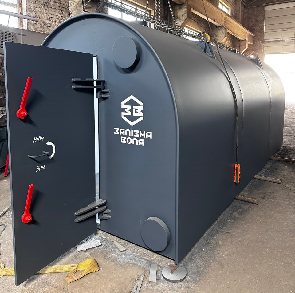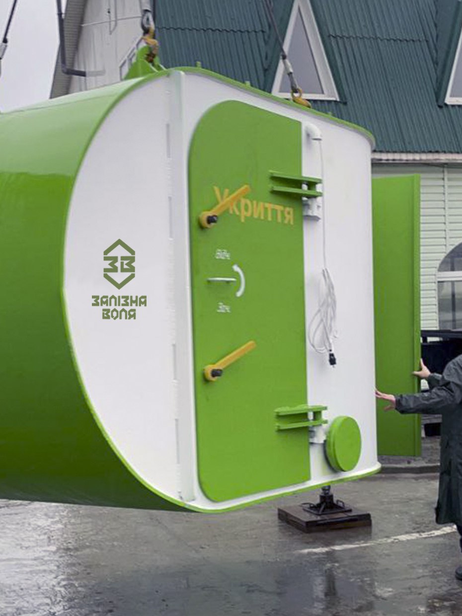 Укриття місткістю 10 осіб. Може встановлюватись як всередині виробничих приміщень, так і на вулиці. Витримує дію ударної хвилі, легких та середніх уламків снарядів/дронів/ракет, легкої стрілецької зброї. Товщина металу 20 мм. Спеціальна кругла форма збільшує шанси на рикошет засобів ураження.