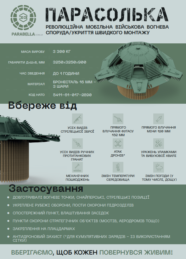 Багато технологічних рішень для цивільних укриттів було запозичено у їх «старшого брата» - фортифікаційного комплекту укриття «Парасолька». Це є спеціальною броньованою спорудою для військових, що є флагманом ТМ «Залізна Воля» та успішно рятує життя наших захисників на найскладніших напрямках фронту. «Парасолька», чи як ще її прийнято називати, «Parabella», випробувана в бою, сертифікована та кодифікована за стандартами НАТО.