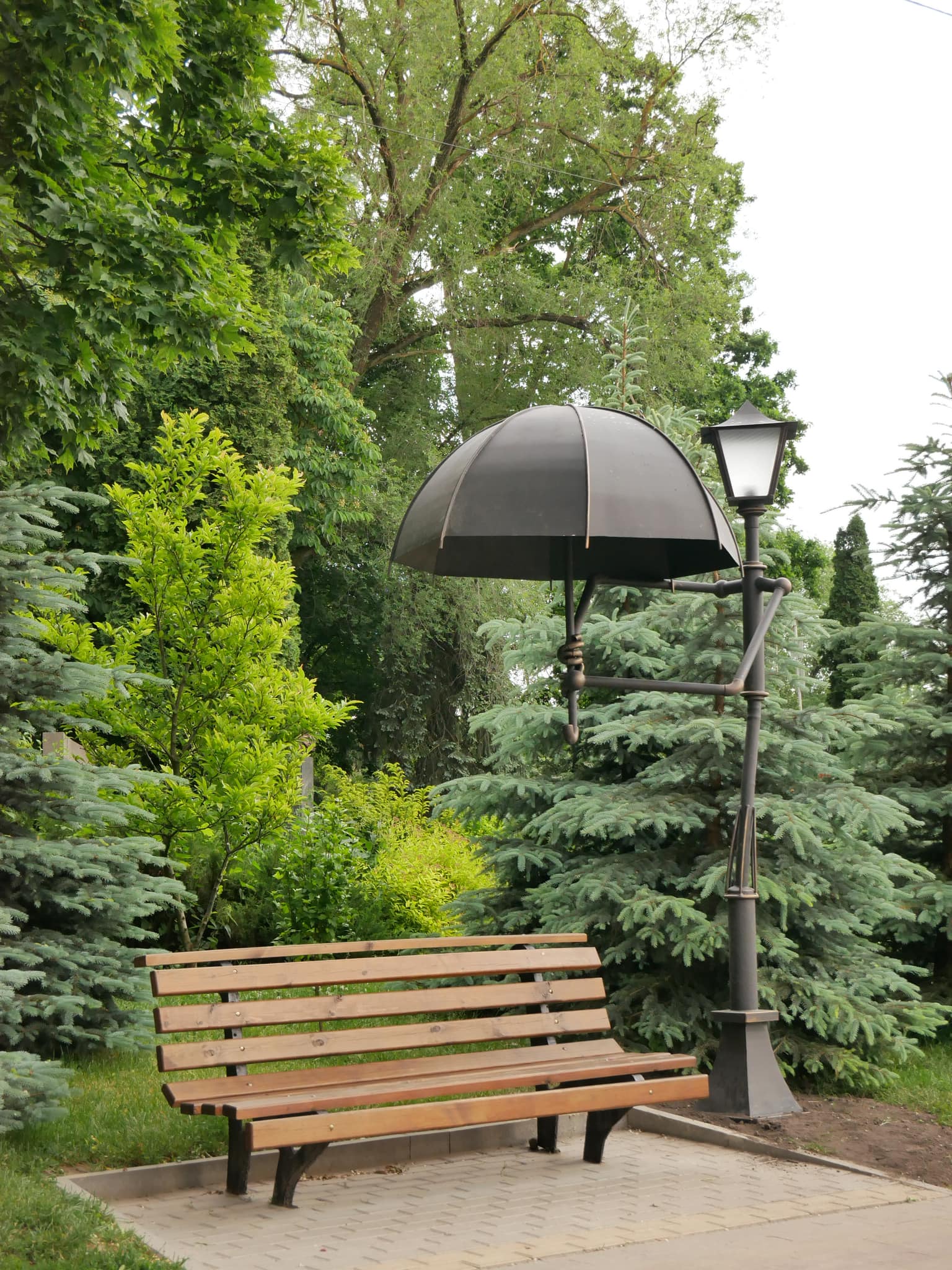 Ліхтар оздоблений парасолькою та виконує одразу дві функції: освічує вулички парку та захищає від дощу. Також це місце може бути оригінальним місцем для фотосесії.