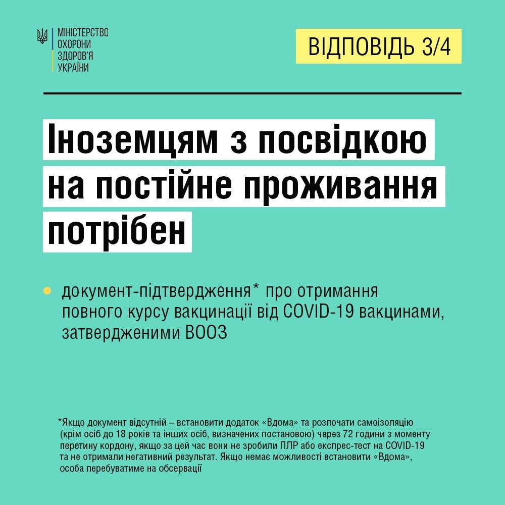 Іноземці, які в'їжджають на територію України, повинні мати страховий поліс на випадок захворювання на COVID-19 та негативний тест на коронавірус, у разі відсутності документа про повний курс вакцинації, іноземець має встановити застосунок "Вдома",