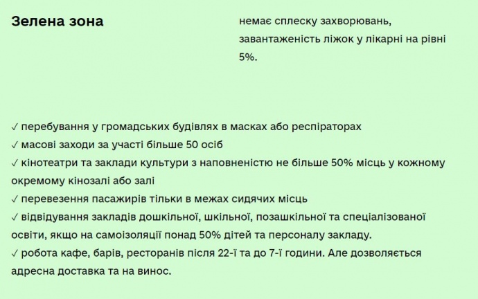 До цього всі регіони були у "жовтій" зоні. У "зеленій" зоні діятимуть наступні обмеження: