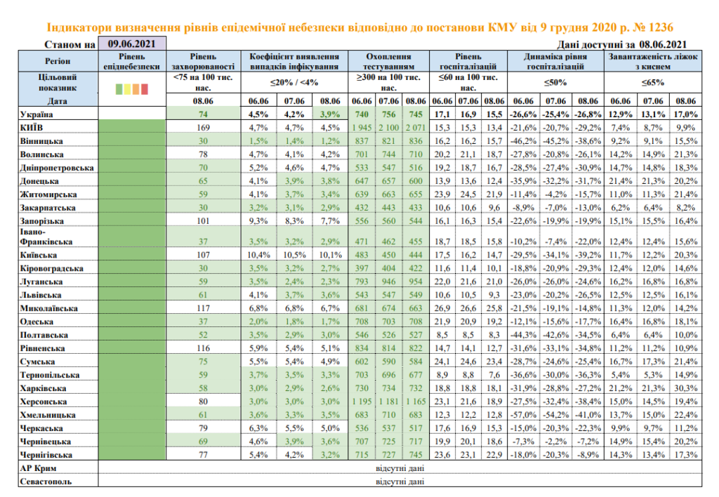 Всі області України опинилися у "зеленій" карантинній зоні, яка передбачає найм'якіші обмеження. Про це повідомляє МОЗ.