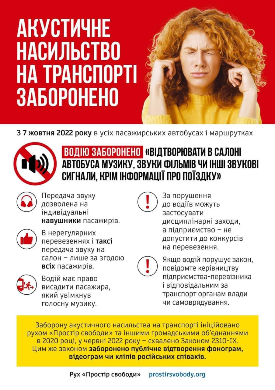 Такий законопроект прийняли ще влітку. Відтак, з 7 жовтня передача звуку дозволена лише на індивідуальні навушники пасажирів .При цьому, музика в салоні може лунати під час нерегулярних перевезень, але лише за згодою всіх пасажирів.