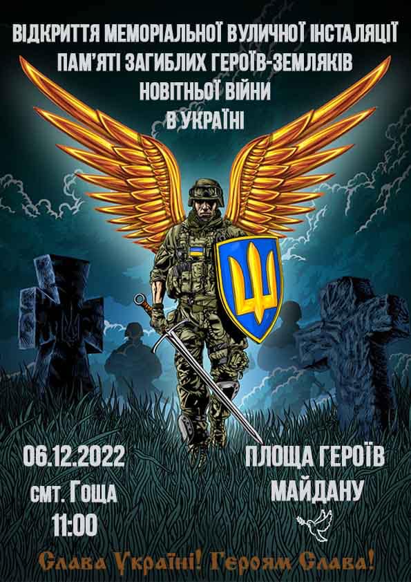 Завтра, 6 грудня, в смт Гоща, що на Рівненщині, відбудться відкриття меморіальної вуличної інсталяції пам’яті загиблих Героїв.