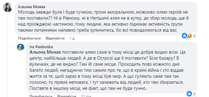 Очевидці зазначають, що таку ситуацію можна поспостерігати часто. У коментарях місцеві обурюються, мовляв "поставили портрети загиблих не у тому місці — над дорогою". Однак є й ті, які наголошують на тому, що так пам'ятну інсталяцію побачить якомога більше людей: і перехожих, і водіїв. А от ті, хто гучно слухає пісні ворожою мовою у такому місці, показують лише свою неповагу та культуру.