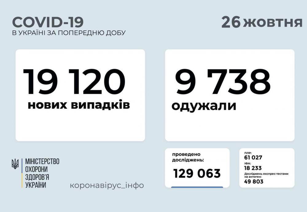 19 120 нових випадків COVID-19 зафіксовано в Україні станом на 26 жовтня 2021 року. Зокрема, захворіли 1414 дітей та 338 медпрацівників.