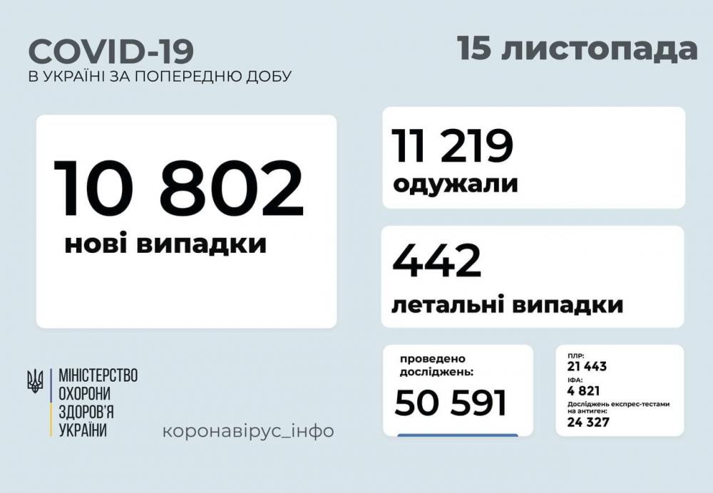 10 802 нові випадки COVID-19 зафіксовано в Україні станом на 15 листопада 2021 року. Зокрема, захворіли 764 дитини та 132 медпрацівники.