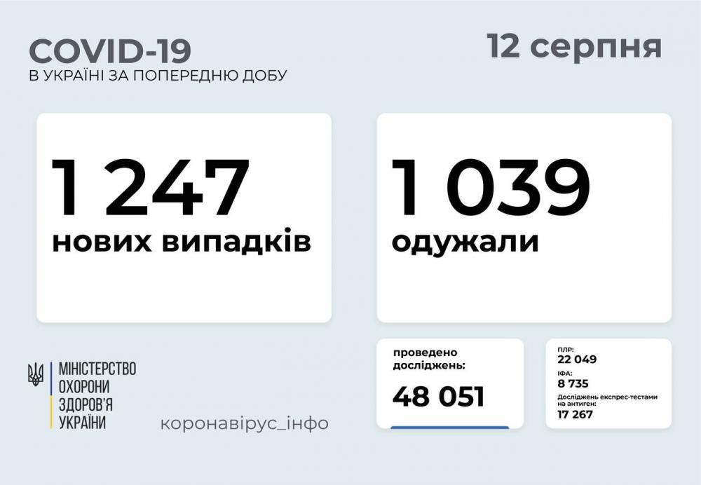 1 247 нових випадків COVID-19 зафіксовано в Україні станом на 12 серпня 2021 року. Зокрема, захворіли 77 дітей та 41 медпрацівник.