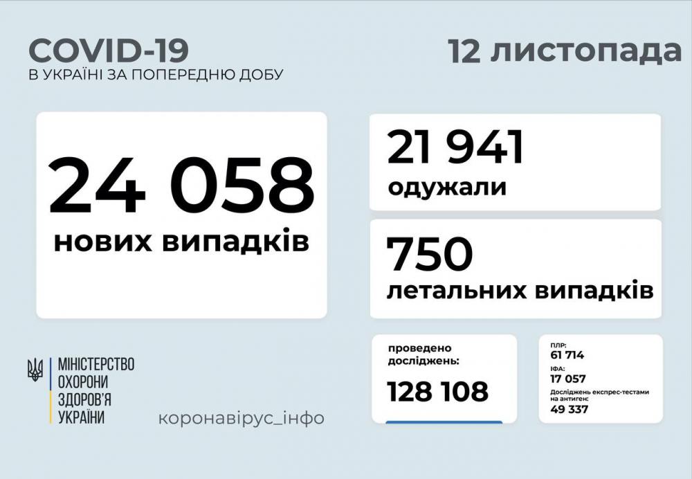 24 058 нових випадків COVID-19 зафіксовано в Україні станом на 12 листопада 2021 року. Зокрема, захворіли 1616 дітей та 468 медпрацівників.