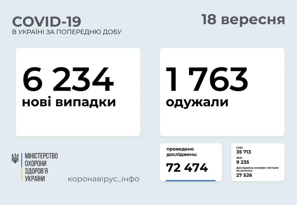 6 234 нові випадки COVID-19 зафіксовано в Україні станом на 18 вересня 2021 року. Зокрема, захворіли 689 дітей та 89 медпрацівників.
