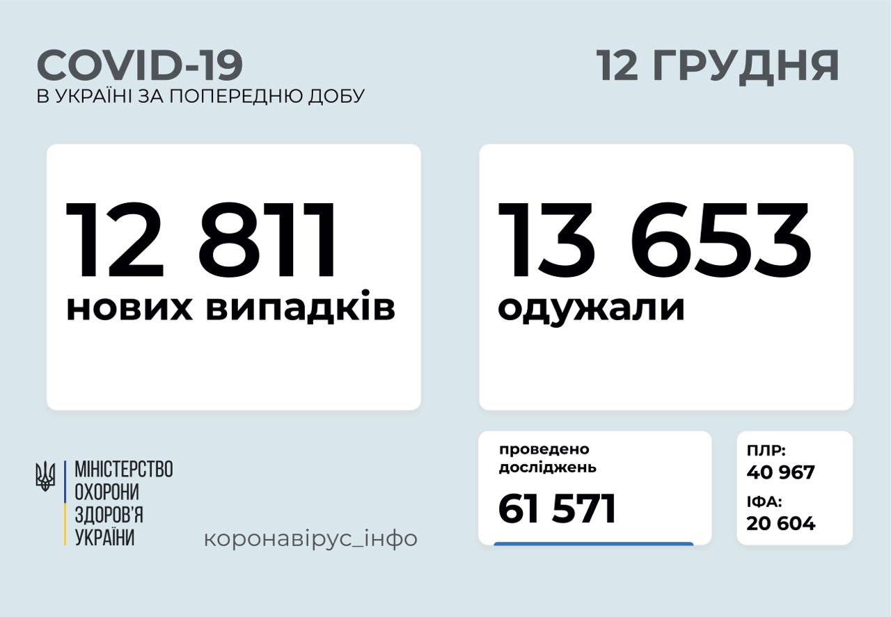 12 811 нових випадків коронавірусної хвороби COVID-19 зафіксовано в Україні станом на 12 грудня 2020 року. Зокрема, захворіли 593 дитини та 572 медпрацівники.