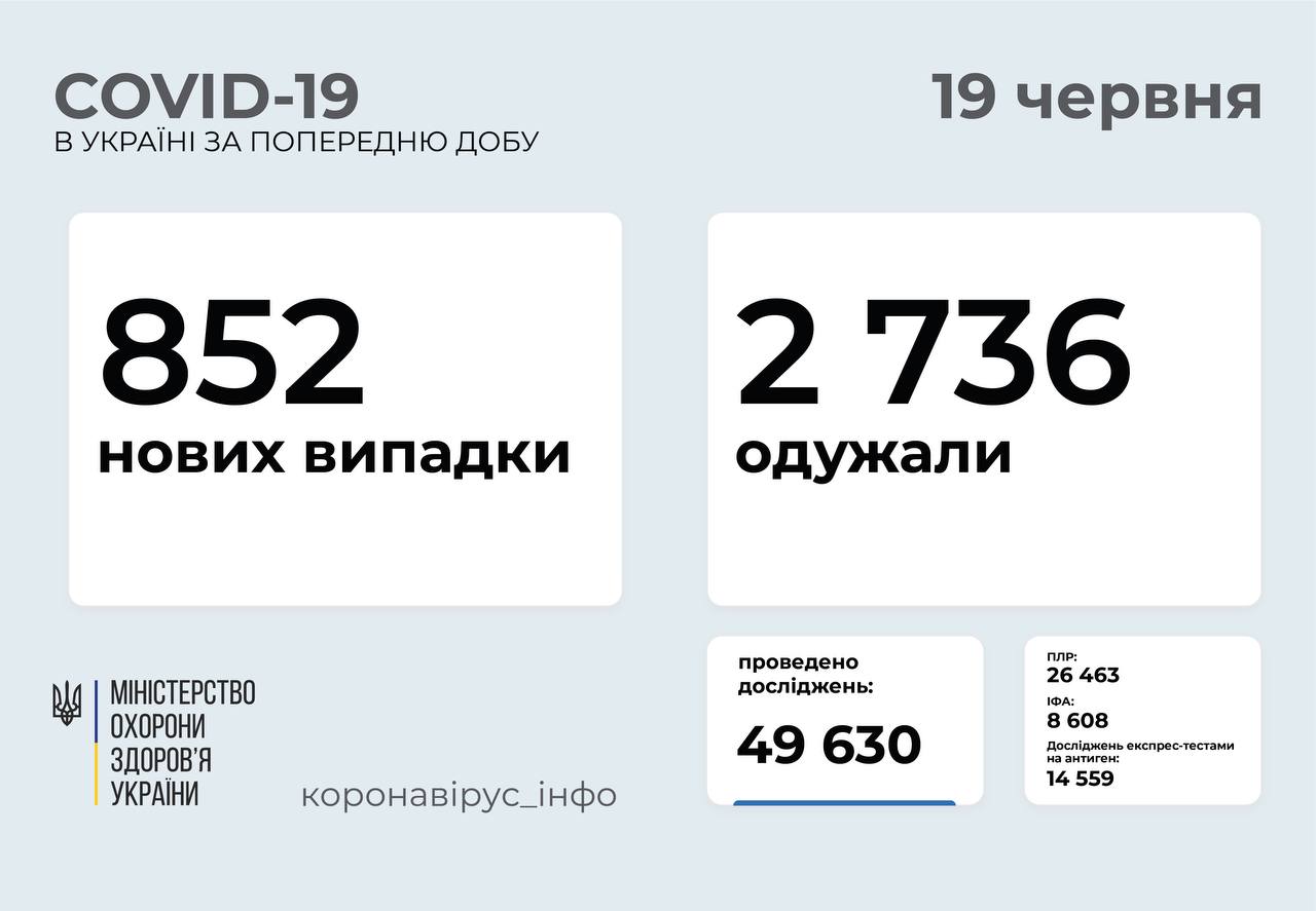 852 нових випадки коронавірусної хвороби COVID-19 зафіксовано в Україні станом на 19 червня 2021 року. Зокрема, захворіли 23 дитини та 41 медпрацівник.