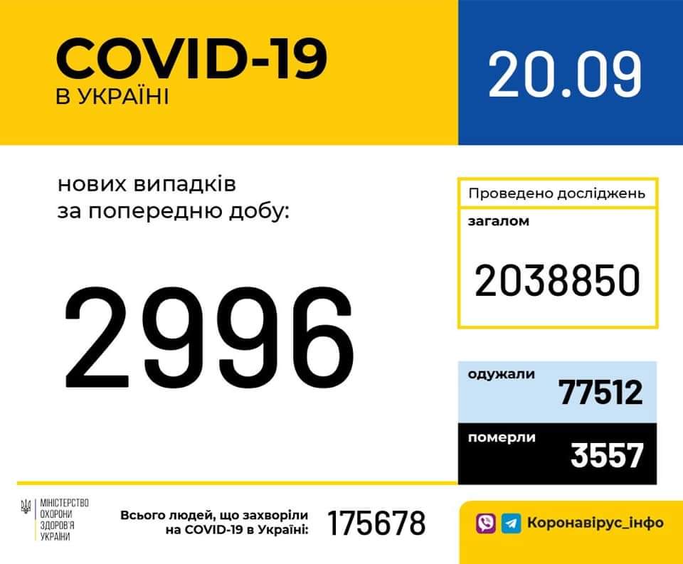 20 вересня (станом на 9:00) в Україні 175 678 лабораторно підтверджених випадків COVID-19, із них 3 557 летальних, 77 512 пацієнтів одужало.