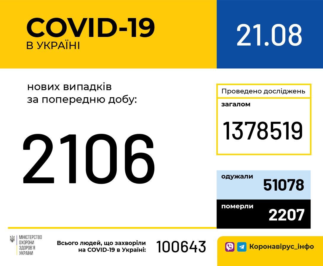 Станом на ранок, 21 серпня, в Україні 100 643 лабораторно підтверджені випадки COVID-19, з них 2207 летальних, 51 078 пацієнтів одужало. За добу зафіксовано 2106 нових випадків. Загалом проведено 1 378 519 тестувань методом ПЛР. Усього за добу одужало 637 пацієнтів.