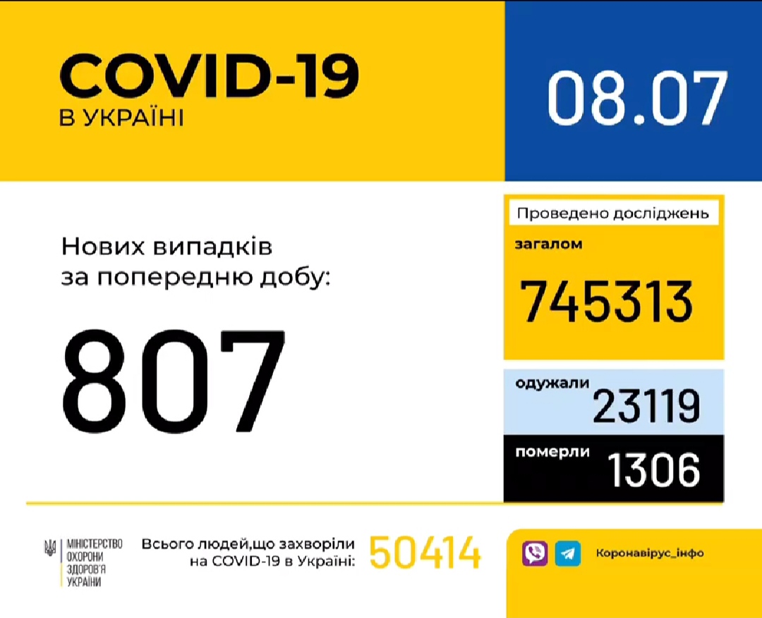 8 липня (станом на 9:00) в Україні 50 414 лабораторно підтверджених випадків COVID-19, з них 1306 летальних, 23 119 пацієнтів одужало. За добу зафіксовано 807 нових випадків. Загалом проведено 745 313 тестувань методом ПЛР.