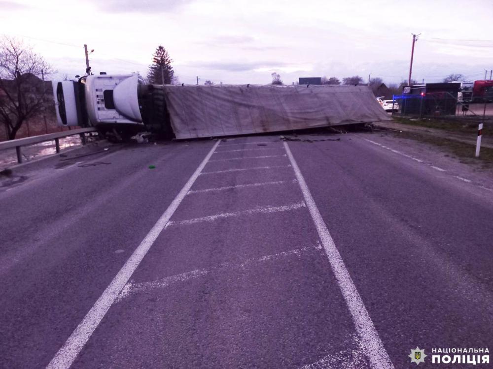 Вантажівка внаслідок удару перекинулась та перекрила трасу.