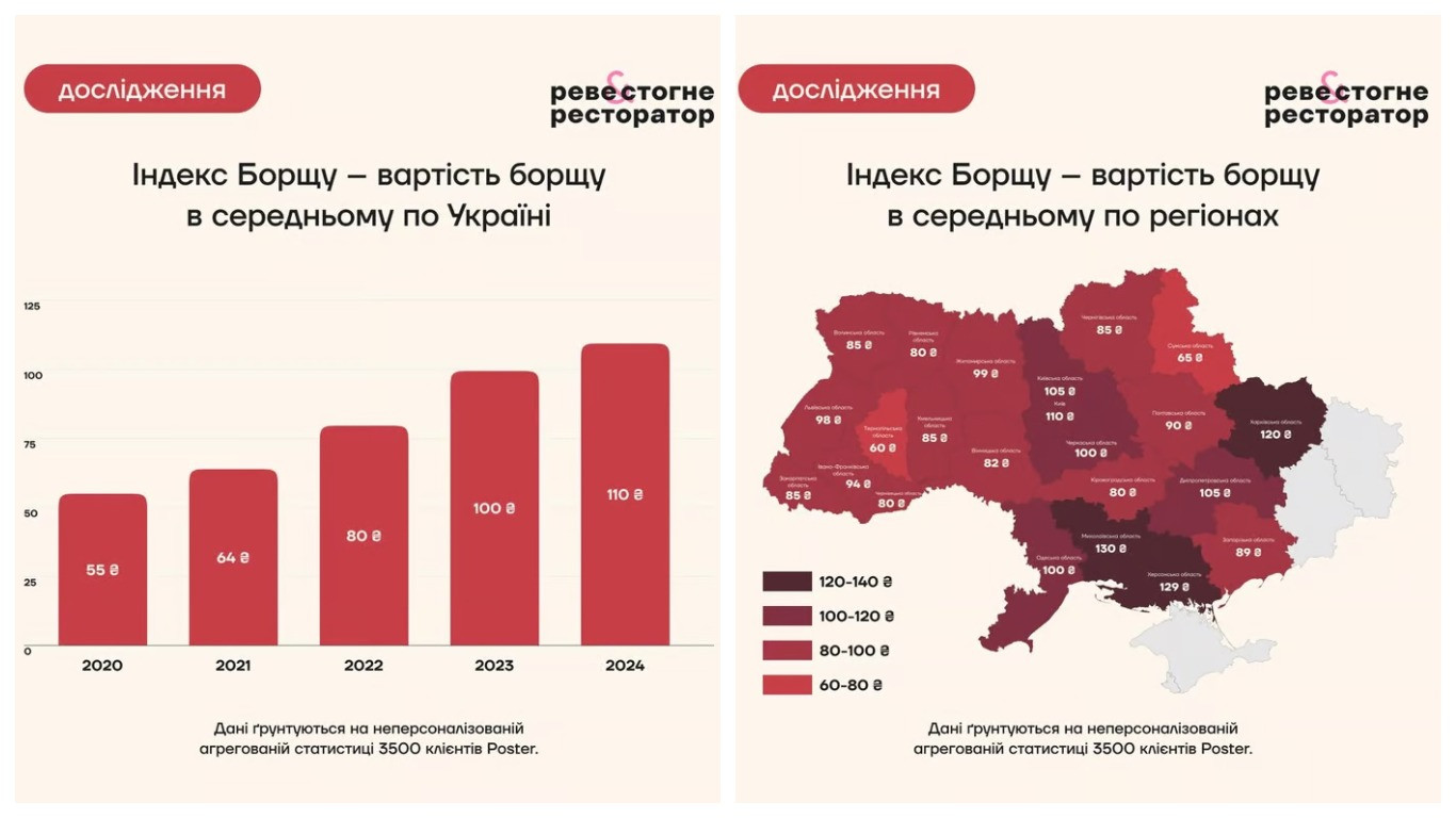 Загалом індекс борщу виріс у 2 рази за останні роки. Вартість тарілки борщу в закладах України виросла з 55 грн у 2020 році до 110 грн у 2024. Серед основних причин такого зростання індексу борщу називають прискорення інфляції, ослаблення курсу гривні, подорожчання овочів, збільшення витрат на електроенергію та оплату праці.