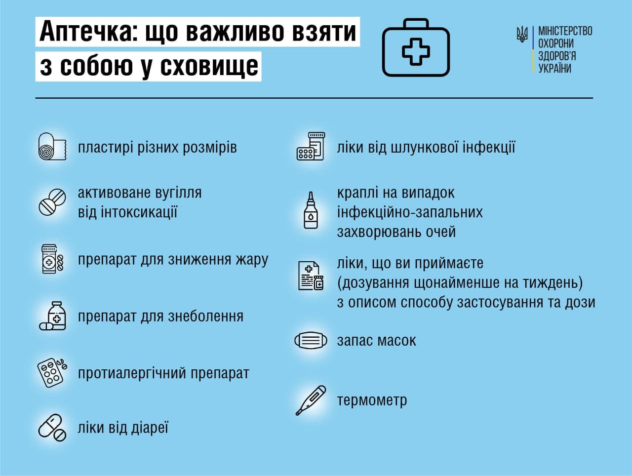 Окрім теплих речей, води та продуктів необхідно взяти з собою аптечку. Складіть усе необхідне в спеціальну сумку або косметичку. Що саме має бути в аптечці — в інфографіці МОЗ.