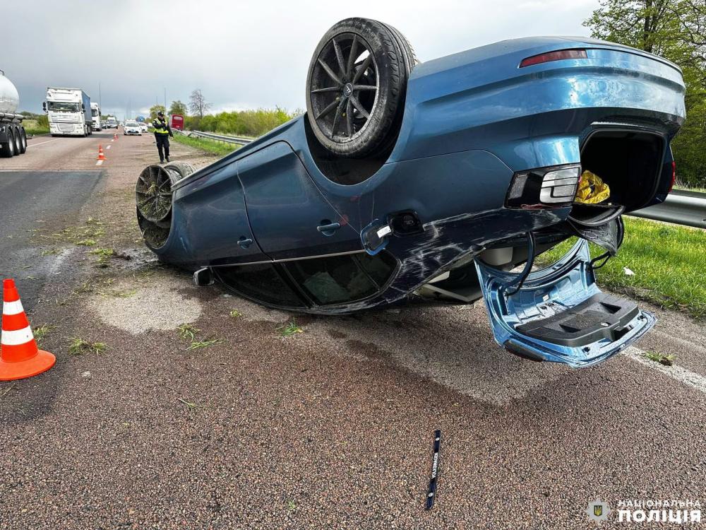 Попередньо відомо, що водій легкового автомобіля не впорався із керуванням та врізався у відбійник. Від удару авто перекинулось.