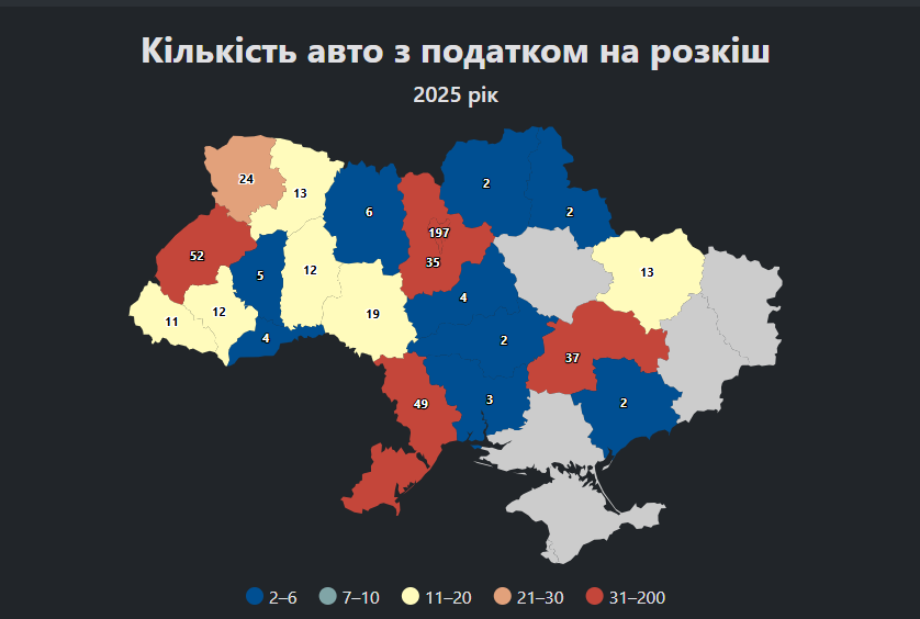 Майже половину всіх розкішних авто зареєстровано у Києві та області — 236 автівок. Ще 52 авто на Львівщині, 49 на Одещині та 37 автівок на Дніпропетровщині. на Рівненщині всього 11.