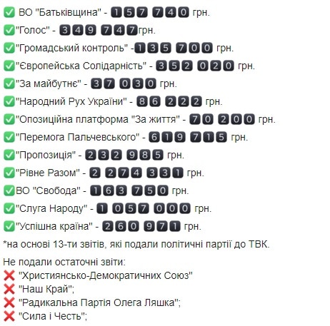 Громадянська мережа ОПОРА / Рівне на офіційній сторінці у Фейсбуці опублікувала інформацію про те, скільки коштів витралили політичні партії на передвиборчу кампанію.