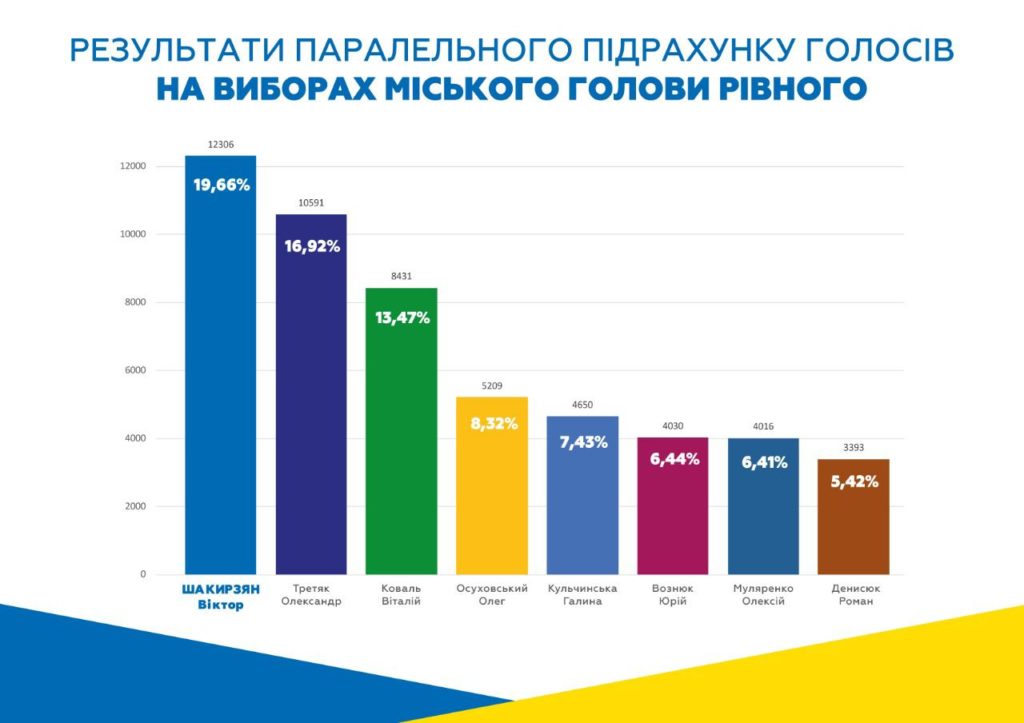 Голова політичної партії “Рівне Разом” набрав найбільшу кількість голосів під час виборів міського голови Рівного та Квасилова. Згідно з результатами паралельного підрахунку, під час виборів міського голови Рівного голоси розподілилися наступним чином:
