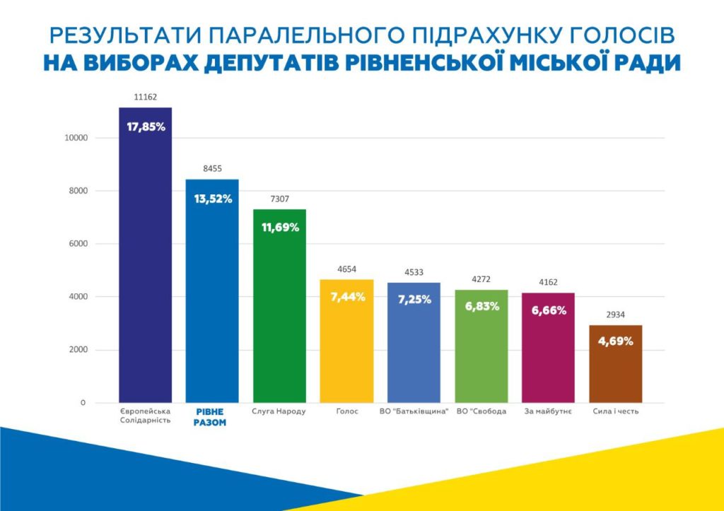 Відповідно до даних паралельного підрахунку голосів, до Рівненської міської ради проходять такі політичні сили: