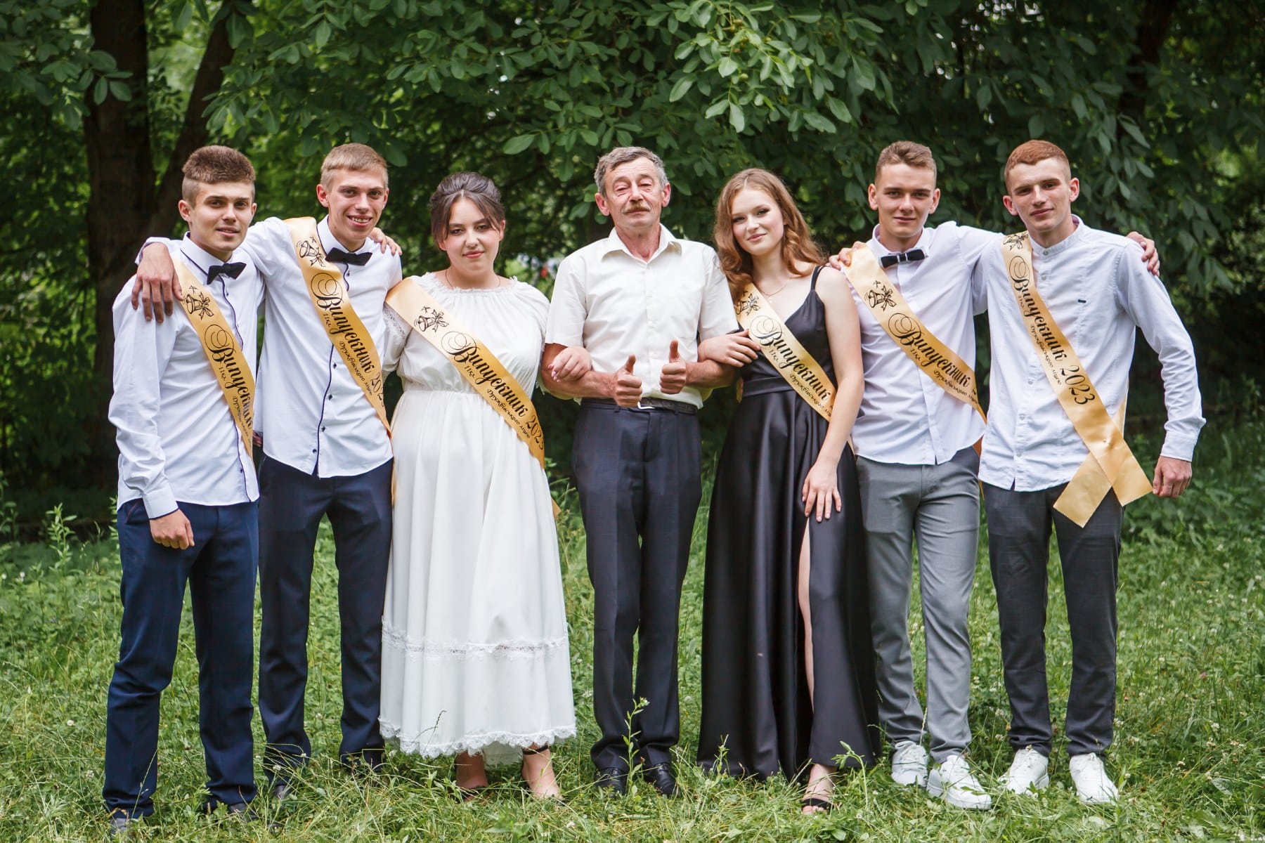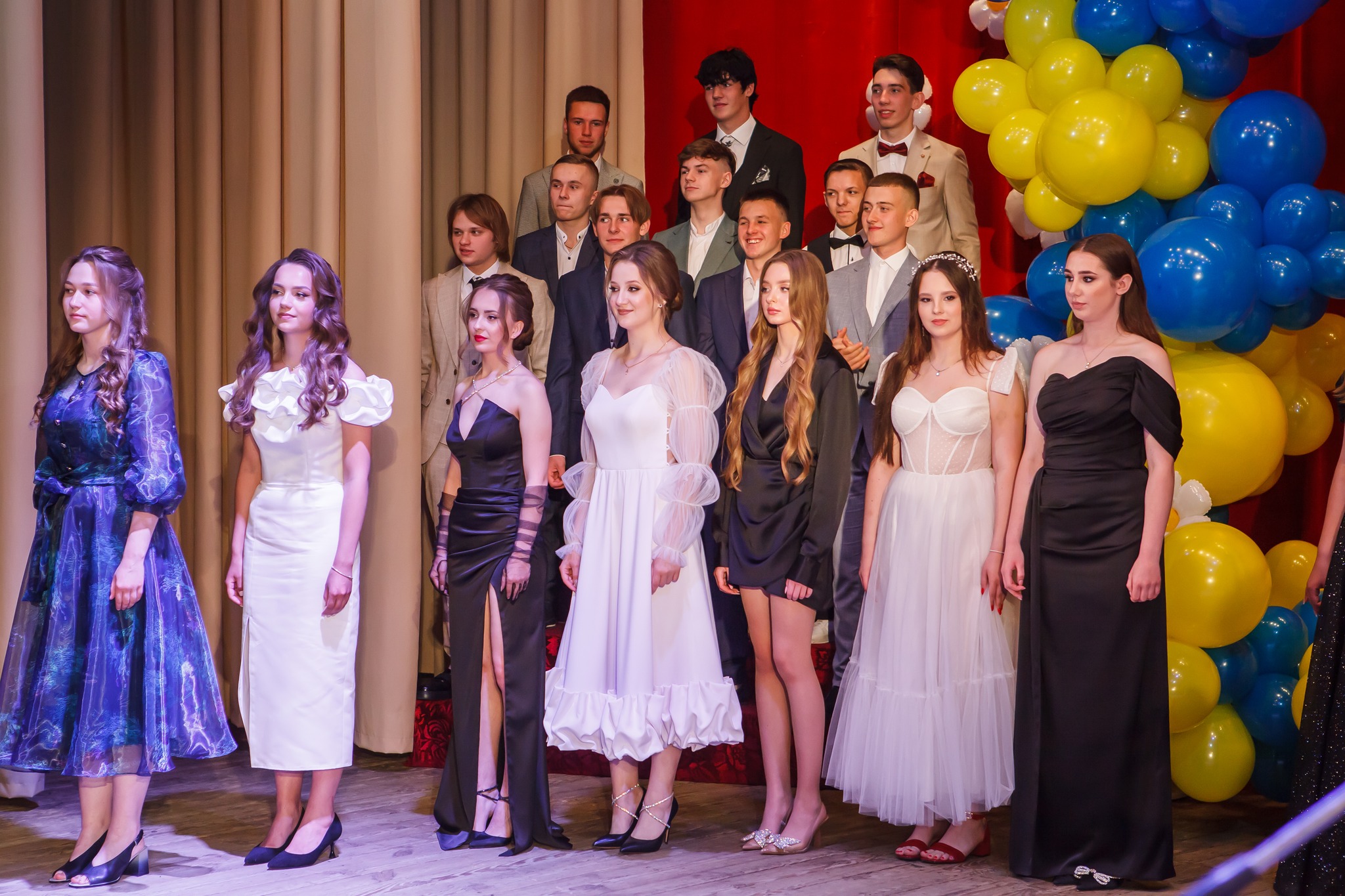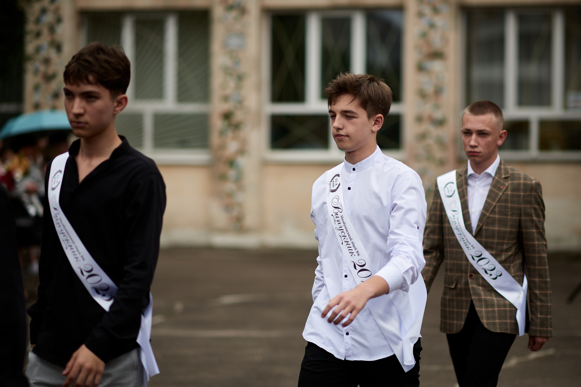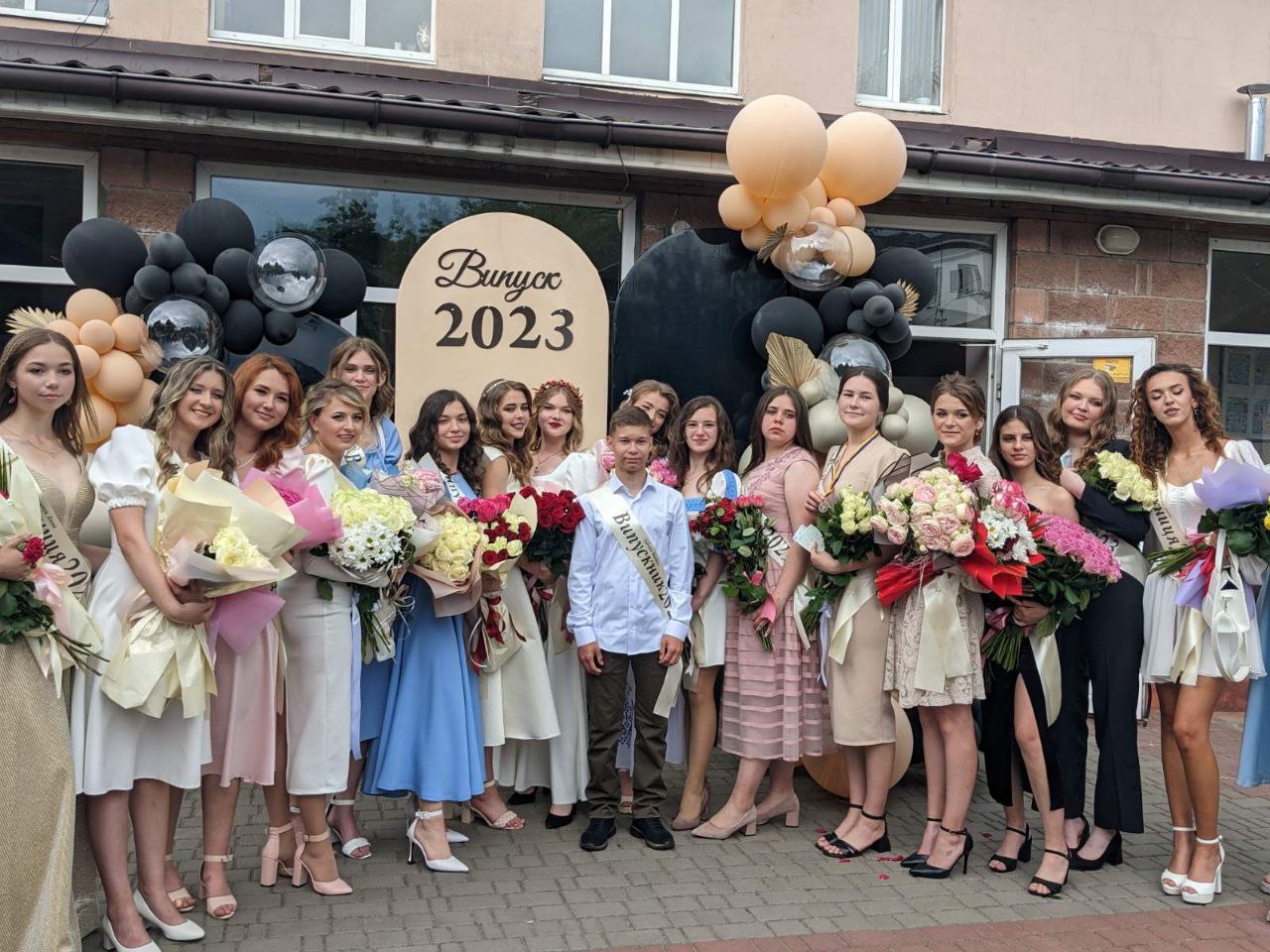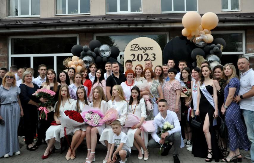 У Дубенському ліцеї №5 на випускницях можна було зустріти сукні світлих кольорів. Хлопці обрали білі сорочки, чорні брюки та доповнили образ кросівками або кедами.