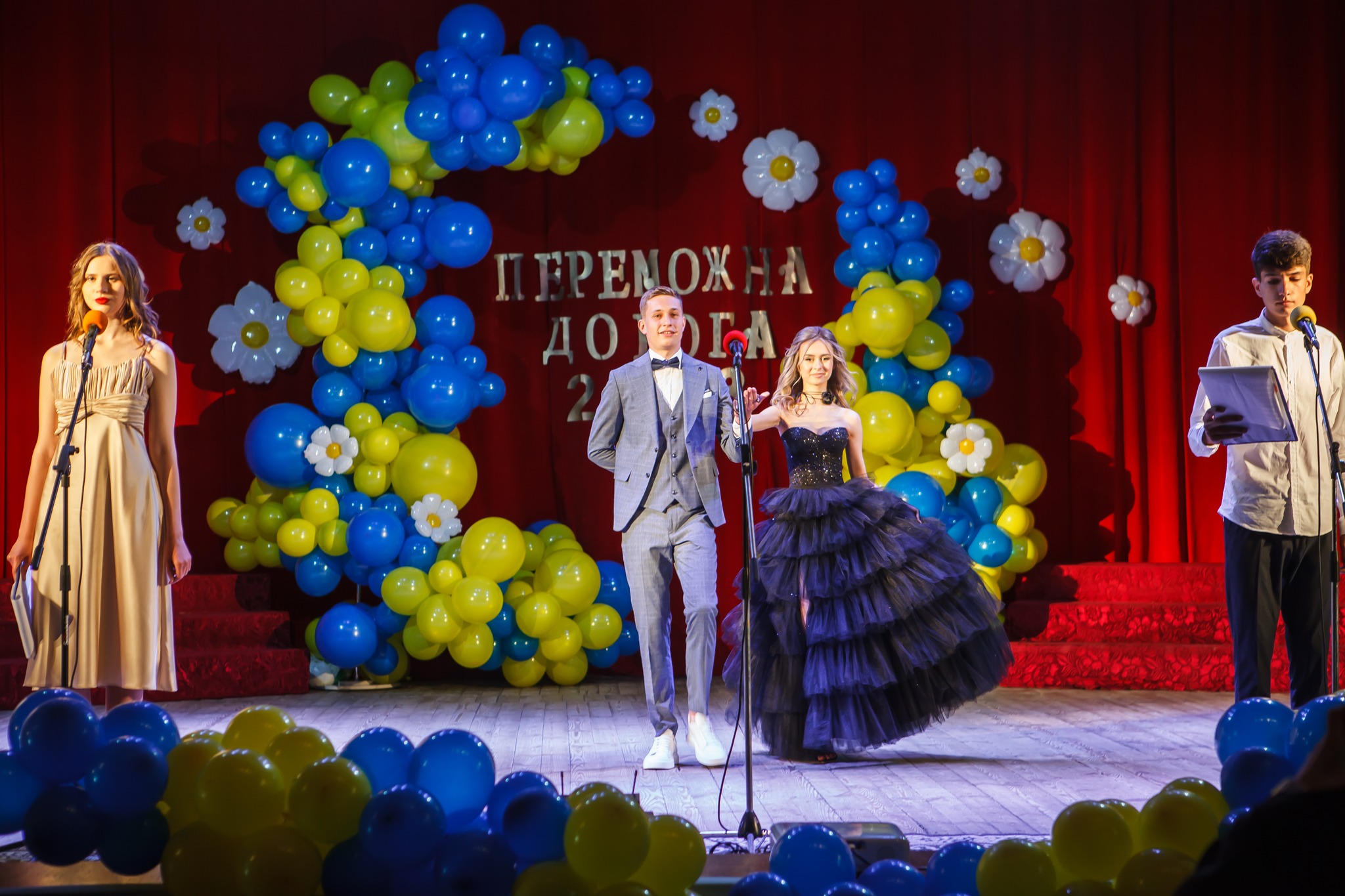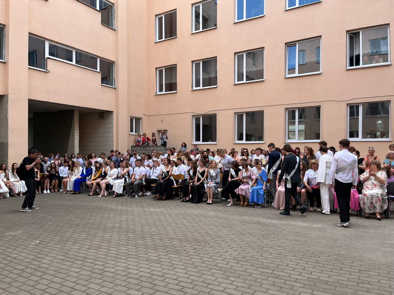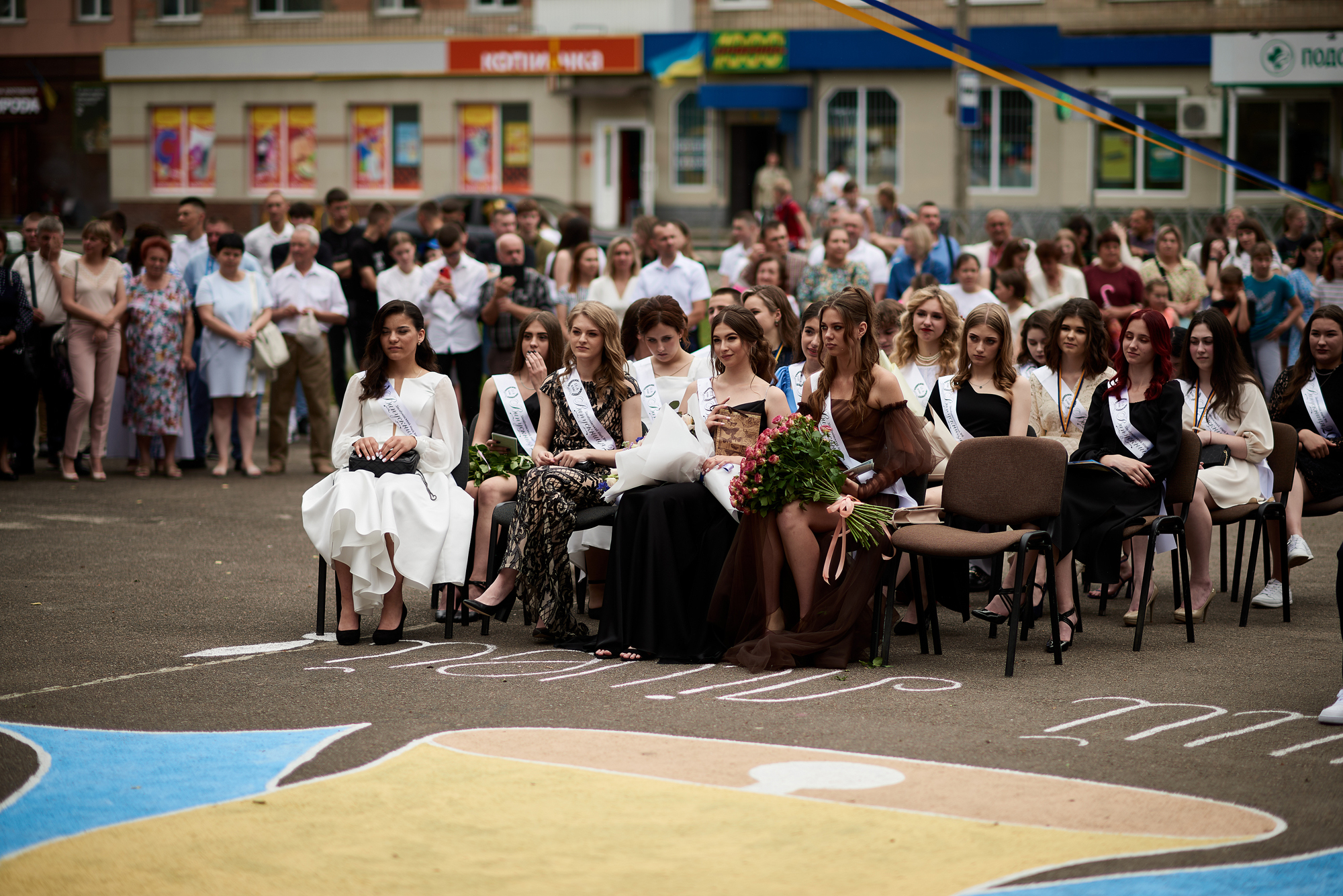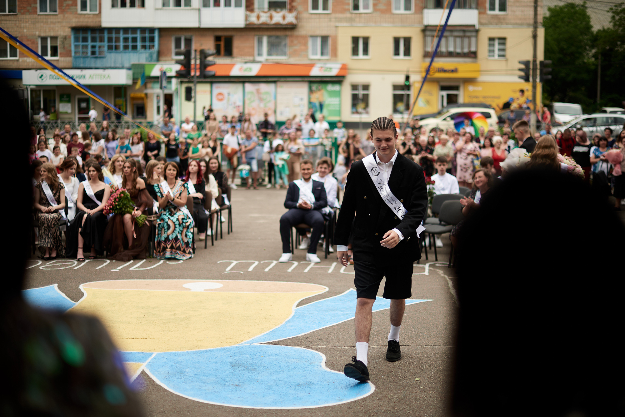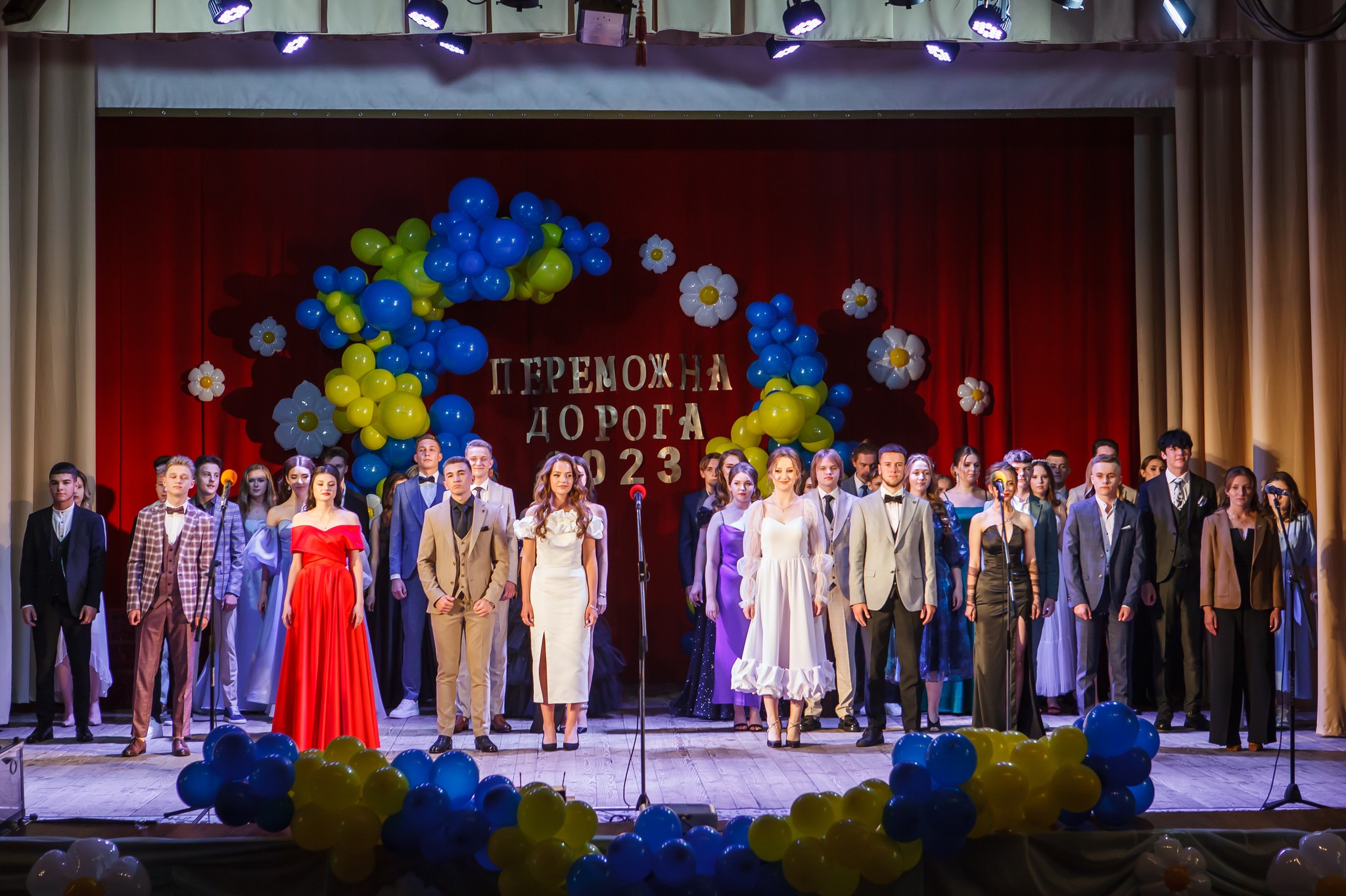 У Дубенському ліцеї №5 на випускницях можна було зустріти сукні світлих кольорів. Хлопці обрали білі сорочки, чорні брюки та доповнили образ кросівками або кедами.