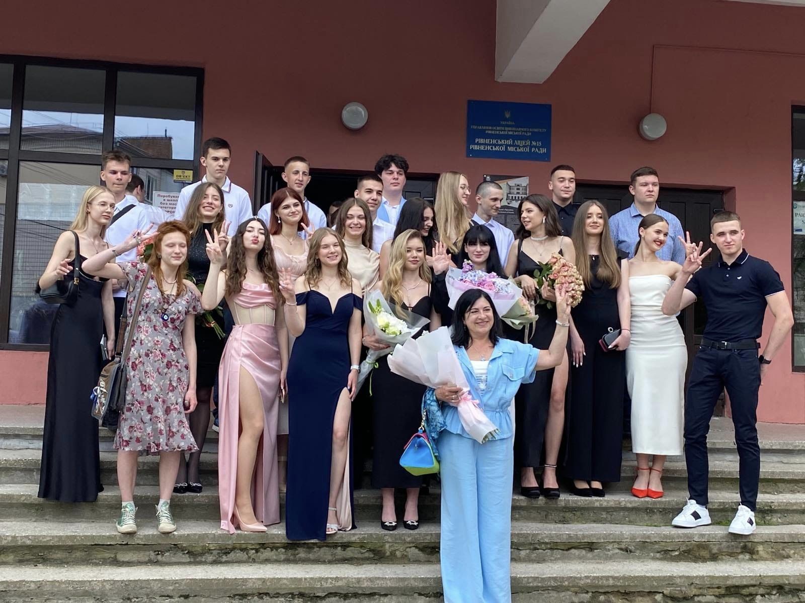 У Рівненському ліцеї №15 у випускниць були переважно не пишні сукні довжини міді. Хлопці були у сорочках та брюках, дехто навіть був у поло.