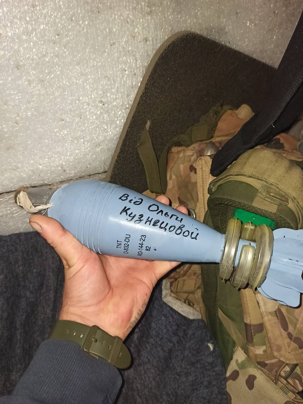 На одному з боєприпасів захисники написали «Від Андрія Теверта. "Волонтери 4.5.0», а на іншому "Від Ольги Кузнецової". Обида прилетіли сюрпризом до росіян на окуповані території.