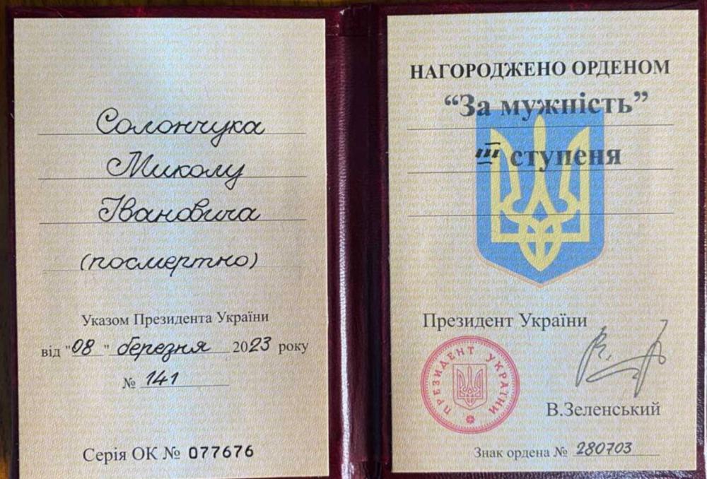 Військового Солончука Миколу Івановича з Березнівщини посмертно нагородили орденом «За мужність» III ступеня.