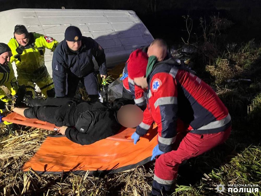 Неподалік патрулював екіпаж поліцейських УПП, які й викликали рятувальників. Працівники ДСНС деблокували кермувальника та витягли з кювету бус.