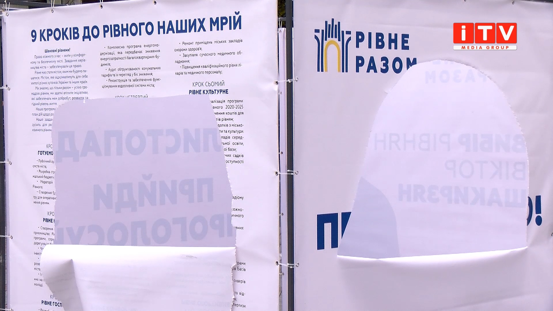 Невідомі пошкодили агітаційні куби кандидата на посаду міського голови Віктора Шакирзяна. Це трапилося в ніч на 9 листопада. За словами волонтерів «Рівне Разом» невідомі порізали куби, які знаходились у різних частинах міста. Зокрема, ось цей на майдані Незалежності вже в такому вигляді побачила пані Любов.