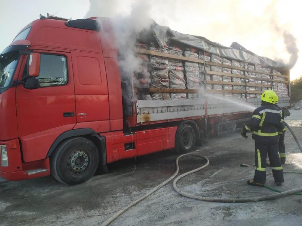 «Вогнем знищено 4,5 т. та пошкоджено 1,7 т. деревного вугілля в палетах, пошкоджено тентове покриття причепа вантажного автомобіля марки «VOLVO». Врятовано поруч розташований інший вантажний автомобіль. Жертв та постраждалих немає», — інформує ДСНС.