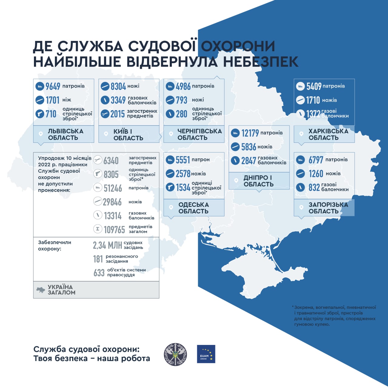 З січня по жовтень 2022 року майже 110 000 заборонених предметів, у тому числі вогнепальна зброя, могли б потрапити до зал суду, потенційно ставши знаряддям збройного нападу чи тиску на свідків, прокурорів або суддів, чи переривання судового процесу.