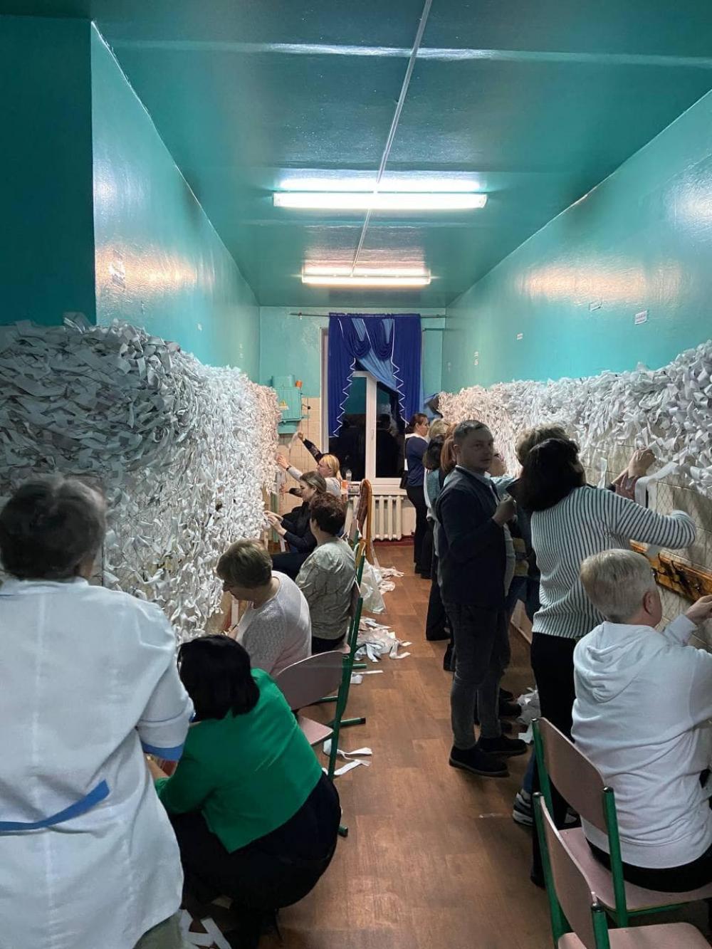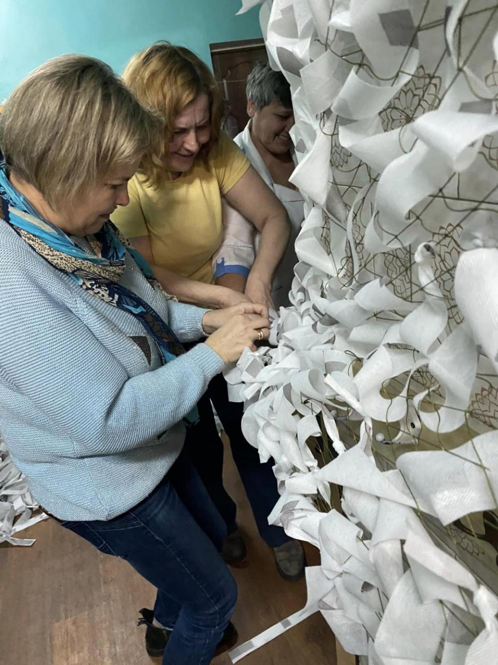 На Рівненщині у Вараському ліцеї №6 волонтери плетуть білі маскувальні сітки для ЗСУ.