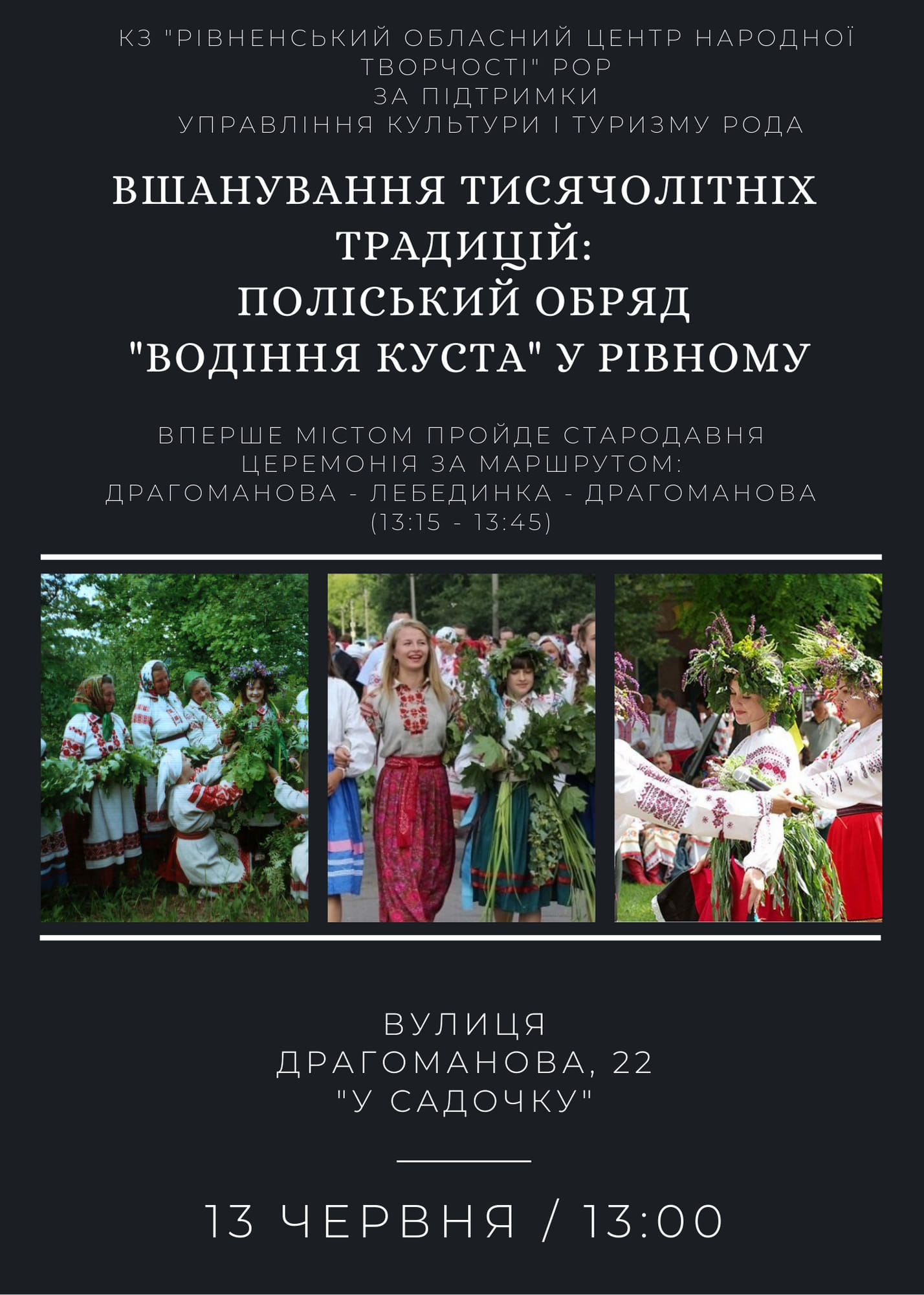 Рівнянам представлять традиції обряду "Водіння куста", який щороку безперервно століттями здійснювався на Трійцю у громаді с. Сварицевичі, що на Дубровиччині.