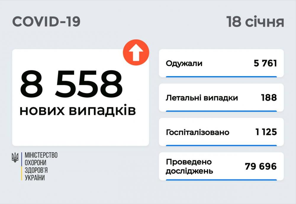 8 558 нових випадків COVID-19 зафіксовано в Україні станом на 18 січня 2022 року. Зокрема, захворіли 811 дітей та 304 медпрацівники.
