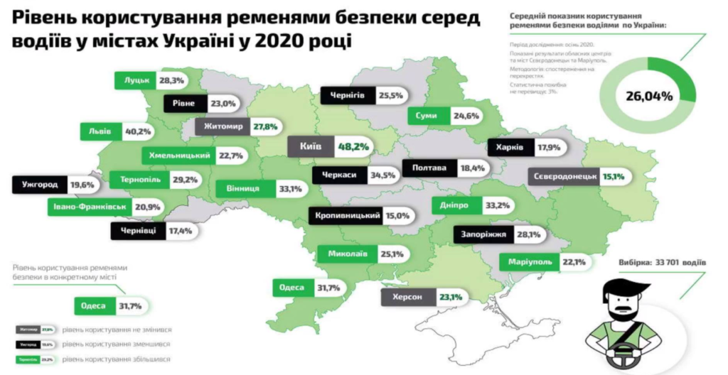 Користування пасками безпеки рівненськими водіями, згідно дослідження, такий: 2020 – 23,0% ↓ 2019 – 25,5% ↑ 2018 – 23,8% ↑ 2017 – 12,7%